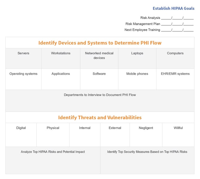 To perform a full risk assessment, you need to list out everywhere your patients’ health information is being stored, as these devices carry sensitive medical information. Examples of such devices include: servers, workstations, networked medical devices, laptops, computers, operating systems, applications, software, mobile phones, EHR/EMR systems, hard drives. The list goes on, and will likely expand as technology is ever changing in the healthcare industry. Be sure to list out as many as you can so your risk assessment is as accurate as possible.